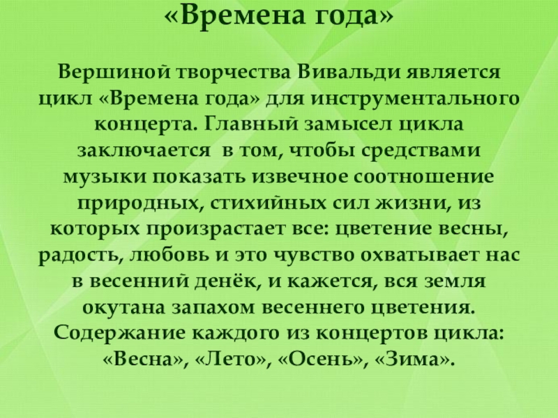 Вершиной творчества Вивальди является цикл «Времена года» для инструментального