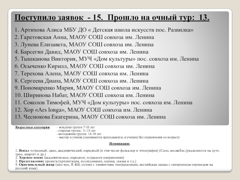 1. Вокал эстрадный, джаз, академический, народный (в том числе фольклор и этнография) (Соло, ансамбль (разделяются на дуэт, трио, квартет и др.)