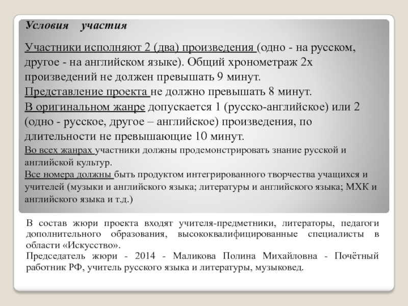 Председатель жюри - 2014 - Маликова Полина Михайловна - Почётный работник РФ, учитель русского языка и литературы, музыковед.