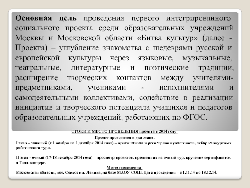 СРОКИ И МЕСТО ПРОВЕДЕНИЯ проекта в 2014 году: