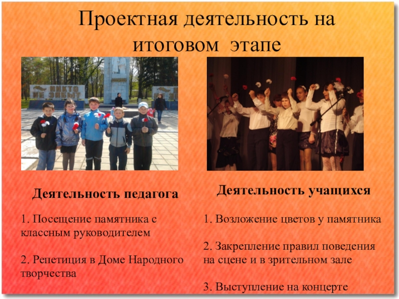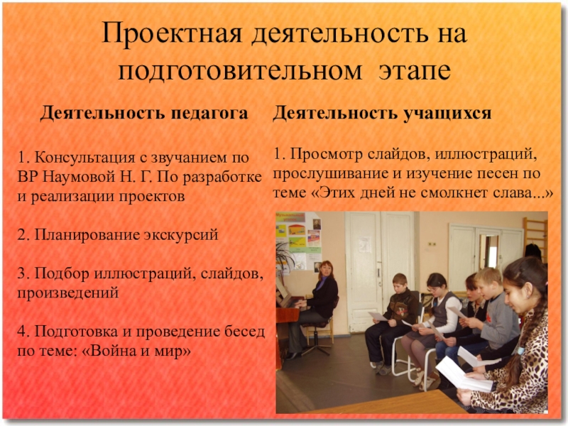 1. Просмотр слайдов, иллюстраций, прослушивание и изучение песен по теме «Этих дней не смолкнет слава...»
