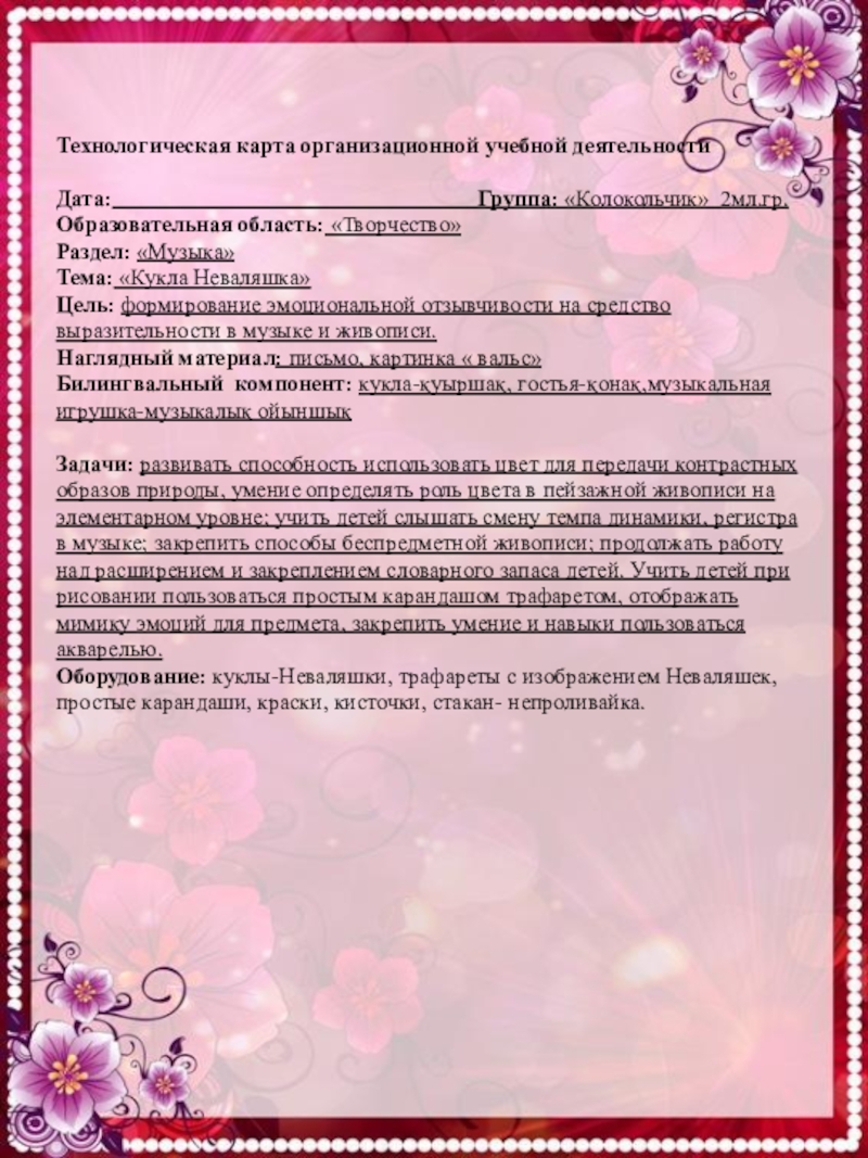 Билингвальный компонент: кукла-қуыршақ, гостья-қонақ,музыкальная игрушка-музыкалық ойыншық