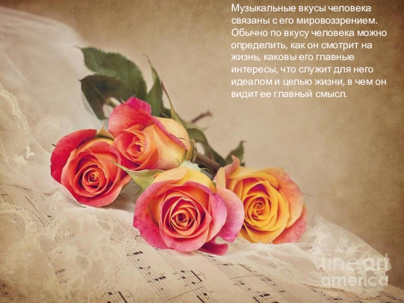 Слайд 7Музыкальные вкусы человека связаны с его мировоззрением. Обычно по вкусу человека