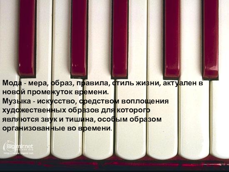 Мода - мера, образ, правила, стиль жизни, актуален в новой промежуток времени.Музыка - искусство, средством воплощения художественных образов для которого являются звук и тишина, особым образом организованные во времени.