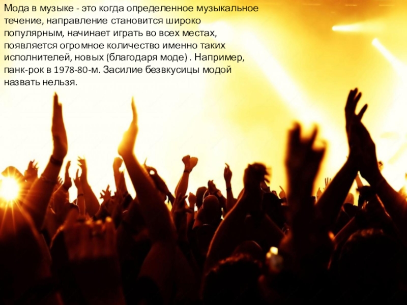 Слайд 8Мода в музыке - это когда определенное музыкальное течение, направление становится