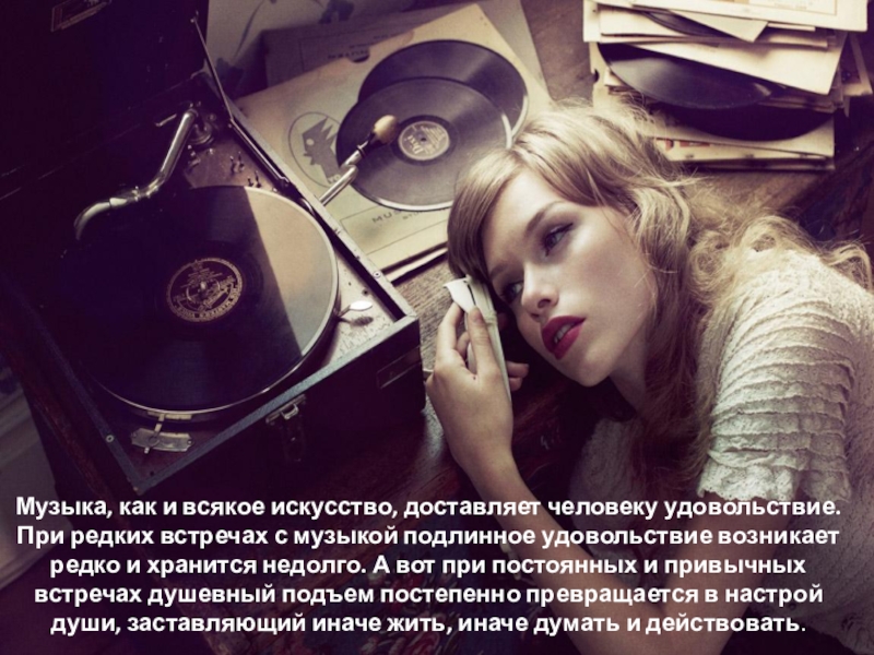 с музыкой подлинное удовольствие возникает редко и хранится недолго. А вот при постоянных и привычных встречах душевный подъем постепенно превращается в настрой души, заставляющий иначе жить, иначе думать и действовать.