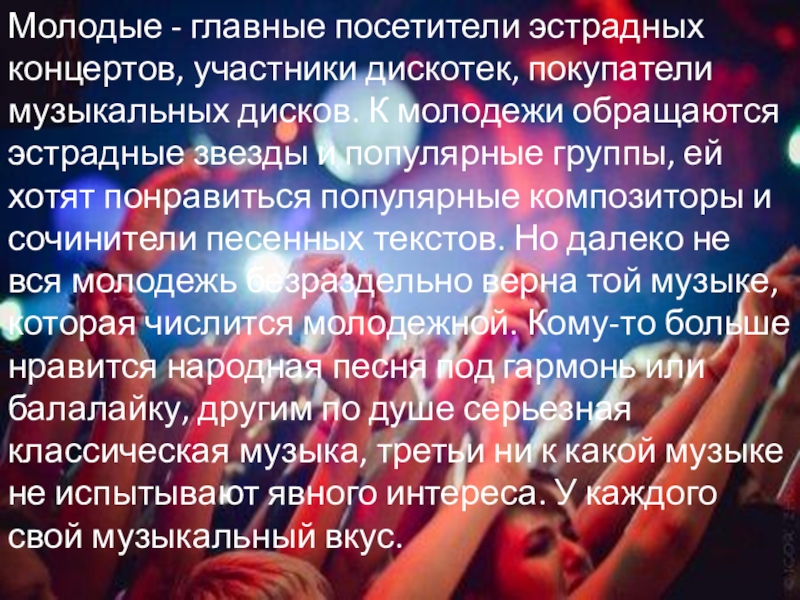 К молодежи обращаются эстрадные звезды и популярные группы, ей хотят понравиться популярные композиторы и сочинители песенных текстов. Но далеко не вся молодежь безраздельно верна той музыке, которая числится молодежной. Кому-то больше нравится народная песня под гармонь или балалайку, другим по душе серьезная классическая музыка, третьи ни к какой музыке не испытывают явного интереса. У каждого свой музыкальный вкус.