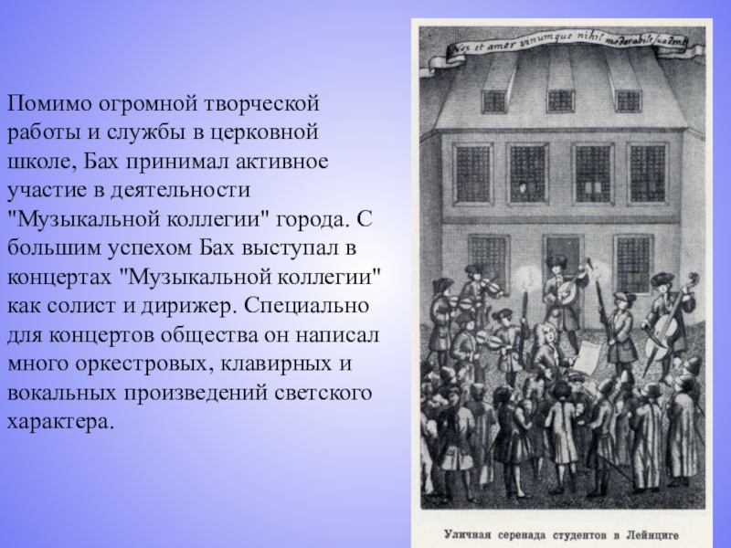 активное участие в деятельности "Музыкальной коллегии" города. С большим успехом Бах выступал в концертах "Музыкальной коллегии" как солист и дирижер. Специально для концертов общества он написал много оркестровых, клавирных и вокальных произведений светского характера.