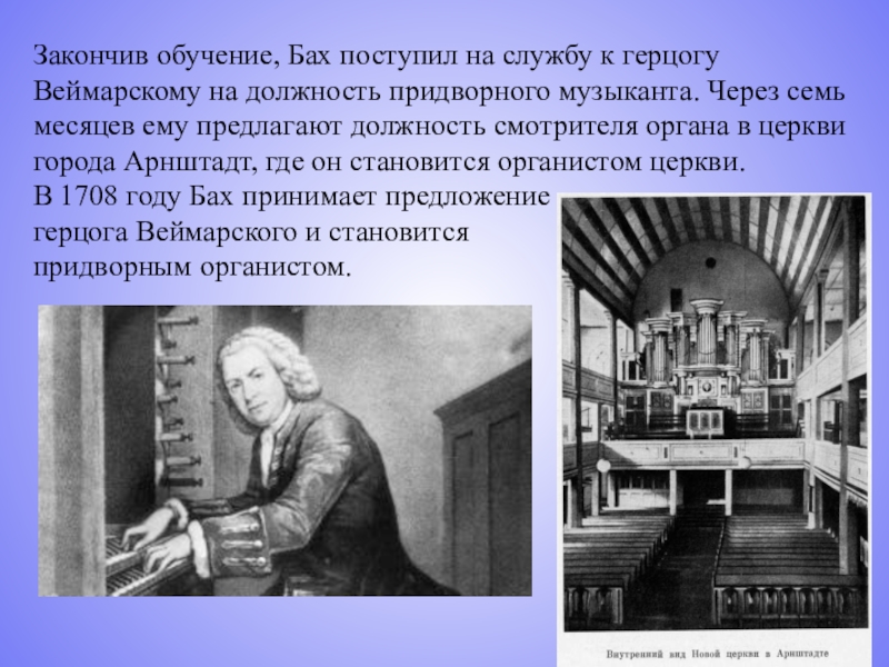 Слайд 6Закончив обучение, Бах поступил на службу к герцогу Веймарскому на должность