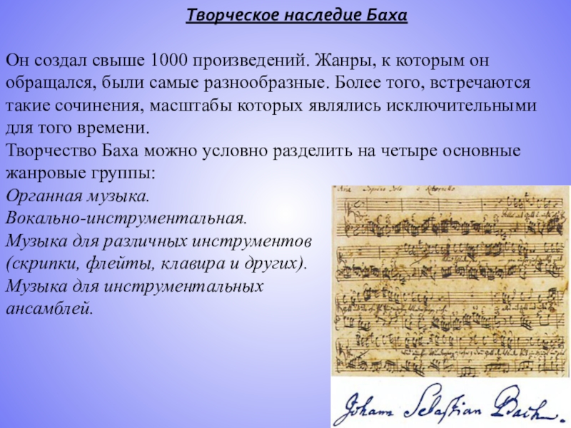 Творчество Баха можно условно разделить на четыре основные жанровые группы: