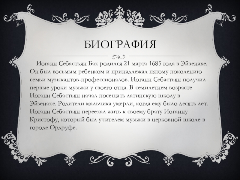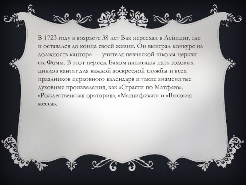 Летом 1720 года Мария Барбара внезапно скончалась, и полтора года спустя Бах вторично вступил в брак с Анной Магдаленой Вилькен, дочерью придворного трубача. Она родила Иоганну Себастьяну еще 13 детей.