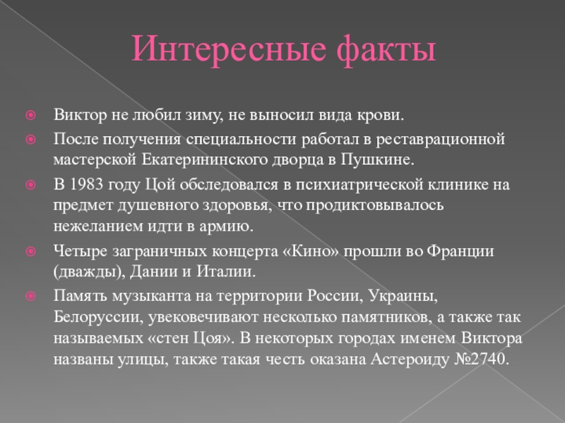времени. Цой Виктор Робертович – легендарный советский рок-музыкант, певец, гитарист и автор песен, основатель и солист культовой группы «Кино». Кроме того, Виктор Цой стал известен благодаря своим работам в кино, сыграв в знаменитых фильмах эпохи Перестройки «Асса» и «Игла». Он пробовал себя в разных видах творчества: писал и исполнял песни, играл в фильмах и рисовал картины. В. Цоя любили за его неповторимый стиль, за то, что он писал песни со смыслом и пытался донести его до слушателя. Мы взяли эту тему, потому что нам нравится творчество Виктора Цоя, мы хотим побольше углубиться в эту тему и познакомить вас с этим талантливым человеком