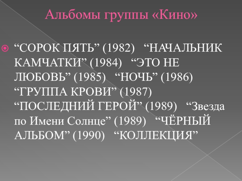 НЕ ЛЮБОВЬ” (1985) “НОЧЬ” (1986) “ГРУППА КРОВИ” (1987) “ПОСЛЕДНИЙ ГЕРОЙ” (1989) “Звезда по Имени Солнце” (1989) “ЧЁРНЫЙ АЛЬБОМ” (1990) “КОЛЛЕКЦИЯ”