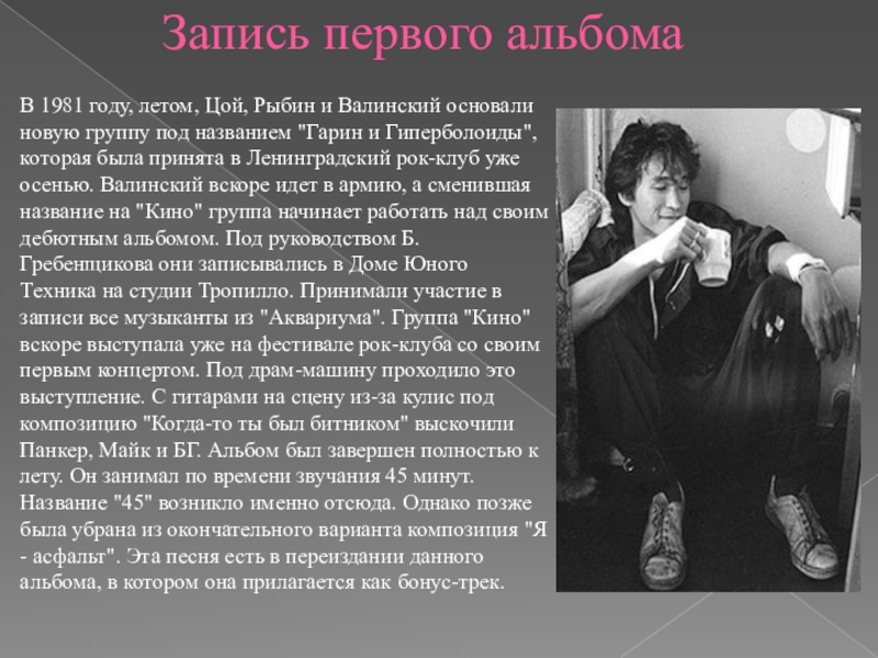новую группу под названием "Гарин и Гиперболоиды", которая была принята в Ленинградский рок-клуб уже осенью. Валинский вскоре идет в армию, а сменившая название на "Кино" группа начинает работать над своим дебютным альбомом. Под руководством Б. Гребенщикова они записывались в Доме Юного Техника на студии Тропилло. Принимали участие в записи все музыканты из "Аквариума". Группа "Кино" вскоре выступала уже на фестивале рок-клуба со своим первым концертом. Под драм-машину проходило это выступление. С гитарами на сцену из-за кулис под композицию "Когда-то ты был битником" выскочили Панкер, Майк и БГ. Альбом был завершен полностью к лету. Он занимал по времени звучания 45 минут. Название "45" возникло именно отсюда. Однако позже была убрана из окончательного варианта композиция "Я - асфальт". Эта песня есть в переиздании данного альбома, в котором она прилагается как бонус-трек.