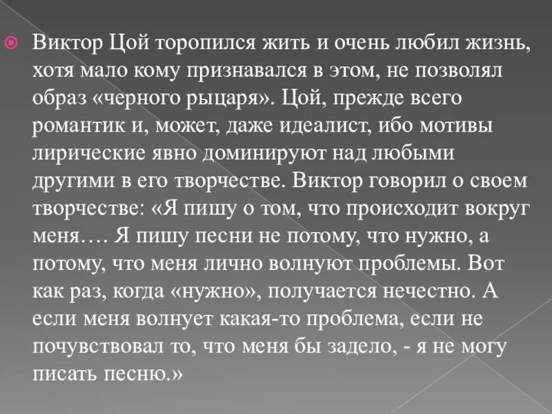 Слайд 9Виктор Цой торопился жить и очень любил жизнь, хотя мало кому