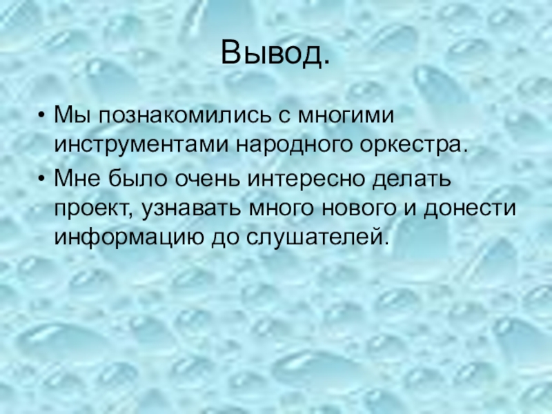Вывод.Мы познакомились с многими инструментами народного оркестра.Мне было очень интересно делать проект, узнавать много нового и донести