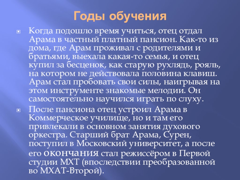 После пансиона отец устроил Арама в Коммерческое училище, но и там его привлекали в основном занятия духового оркестра. Старший брат Арама, Сурен, поступил в Московский университет, а после его окончания стал режиссёром в Первой студии МХТ (впоследствии преобразованной во МХАТ-Второй).