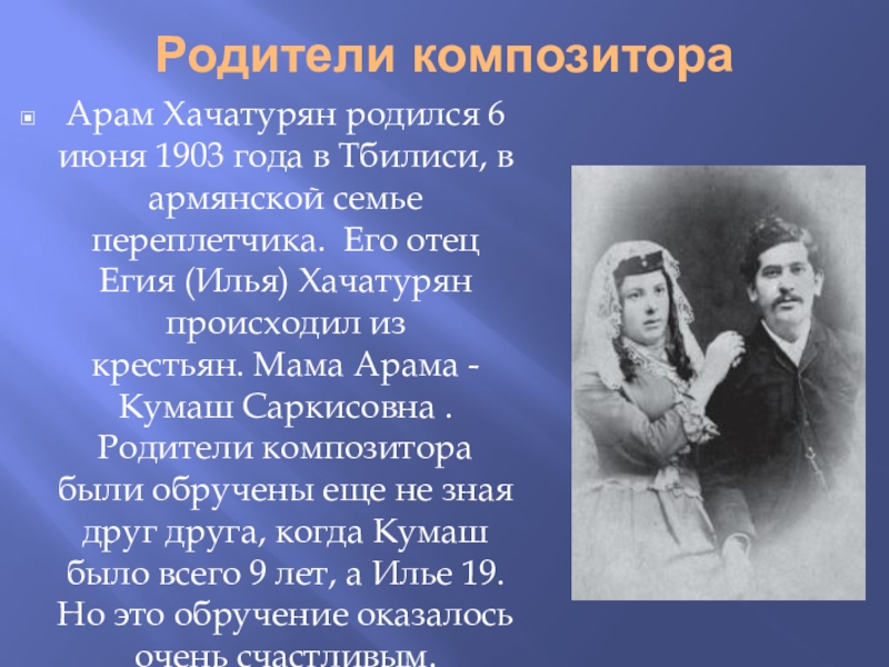 армянской семье переплетчика. Его отец Егия (Илья) Хачатурян происходил из крестьян. Мама Арама - Кумаш Саркисовна . Родители композитора были обручены еще не зная друг друга, когда Кумаш было всего 9 лет, а Илье 19. Но это обручение оказалось очень счастливым.
