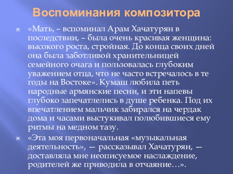 «Мать, – вспоминал Арам Хачатурян в последствии, – была очень