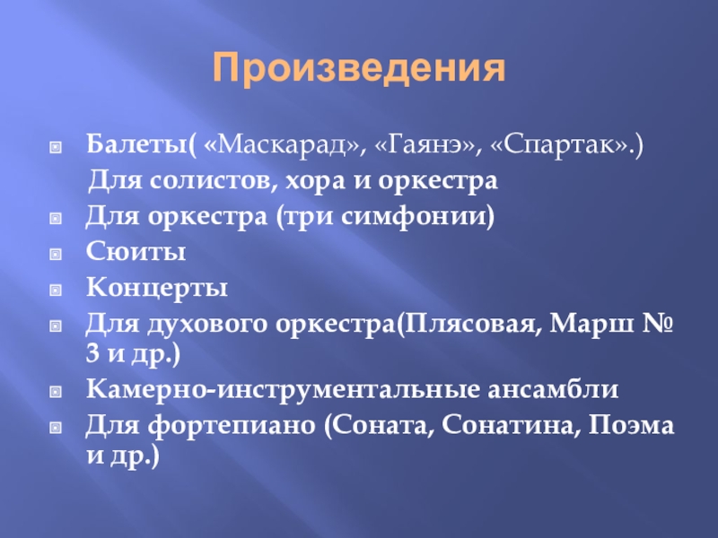 Балеты( «Маскарад», «Гаянэ», «Спартак».)
