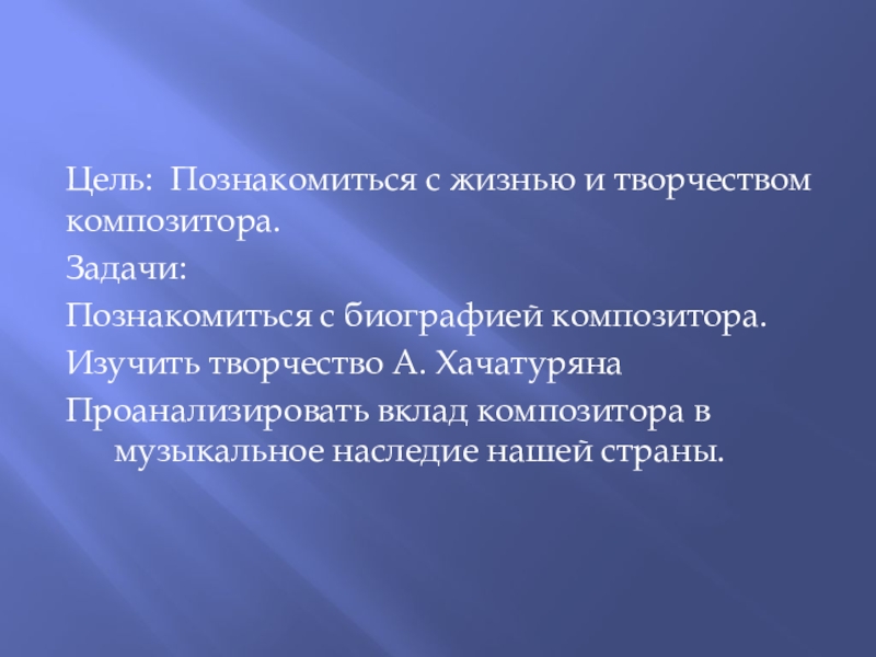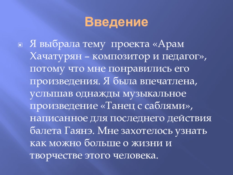 что мне понравились его произведения. Я была впечатлена, услышав однажды музыкальное произведение «Танец с саблями», написанное для последнего действия балета Гаянэ. Мне захотелось узнать как можно больше о жизни и творчестве этого человека.