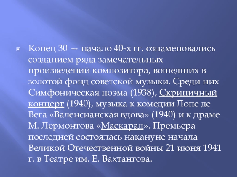 композитора, вошедших в золотой фонд советской музыки. Среди них Симфоническая поэма (1938), Скрипичный концерт (1940), музыка к комедии Лопе де Вега «Валенсианская вдова» (1940) и к драме М. Лермонтова «Маскарад». Премьера последней состоялась накануне начала Великой Отечественной войны 21 июня 1941 г. в Театре им. Е. Вахтангова.