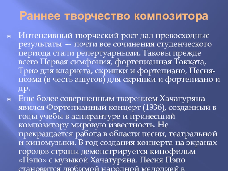известного советского педагога и композитора М. Гнесина. Пытаясь наверстать упущенное в детские годы, Хачатурян интенсивно работает, пополняет свои знания. В 1929 г. Хачатурян поступает в Московскую консерваторию. На 1 курсе занятия по композиции он продолжает у Гнесина, а со 2 курса его руководителем становится Н. Мясковский, сыгравший исключительно важную роль в становлении творческой личности Хачатуряна. В 1934 г. Хачатурян с отличием оканчивает консерваторию и продолжает совершенствоваться в аспирантуре