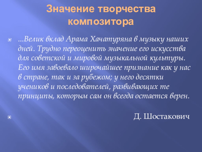 ...Велик вклад Арама Хачатуряна в музыку наших дней. Трудно