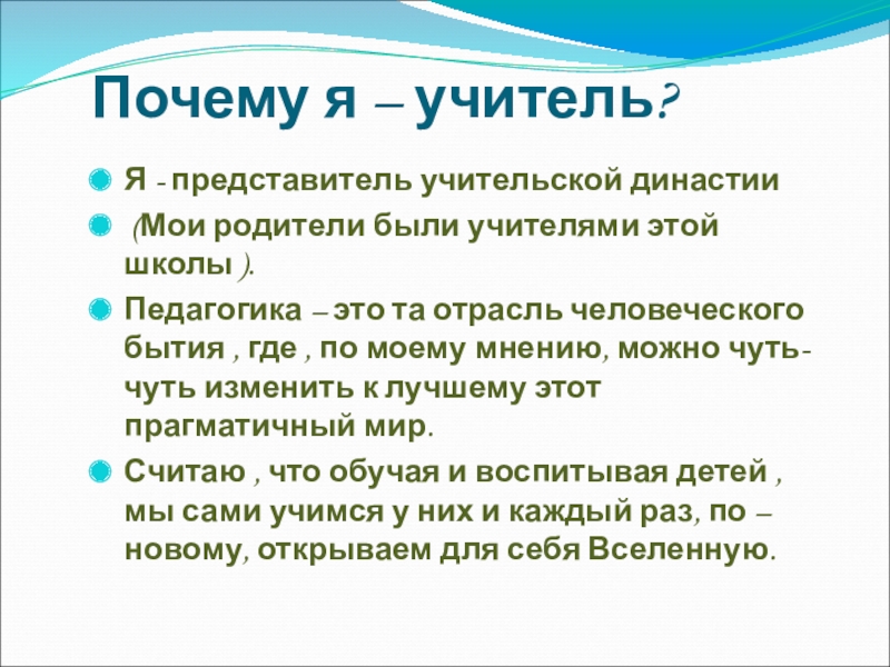 Почему я – учитель?Я - представитель учительской династии (Мои родители были учителями этой школы ).Педагогика – это
