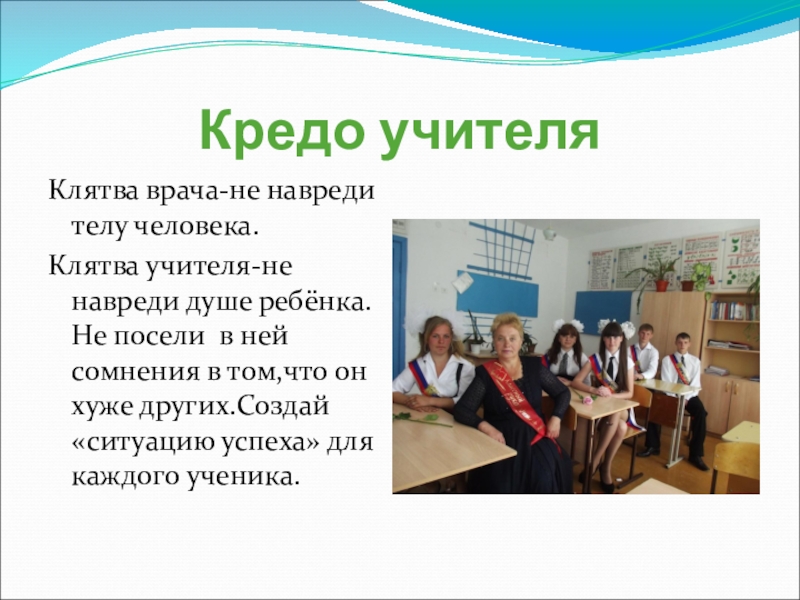Кредо учителяКлятва врача-не навреди телу человека.Клятва учителя-не навреди душе ребёнка.Не посели в ней сомнения в том,что он