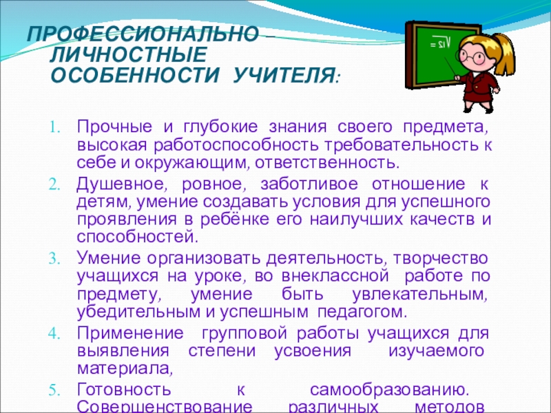 ПРОФЕССИОНАЛЬНО – ЛИЧНОСТНЫЕ  ОСОБЕННОСТИ  УЧИТЕЛЯ:Прочные и глубокие знания своего предмета, высокая работоспособность требовательность к себе