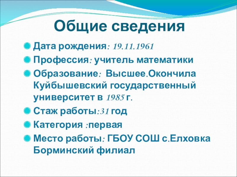 Общие сведенияДата рождения: 19.11.1961Профессия: учитель математикиОбразование: Высшее.Окончила Куйбышевский государственный университет в 1985 г.Стаж работы:31 годКатегория :перваяМесто работы: ГБОУ СОШ с.Елховка Борминский филиал