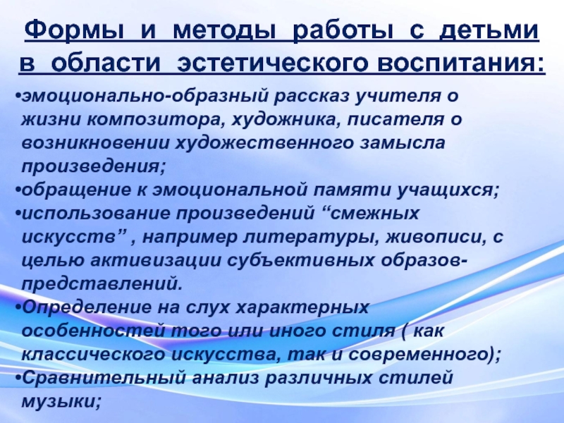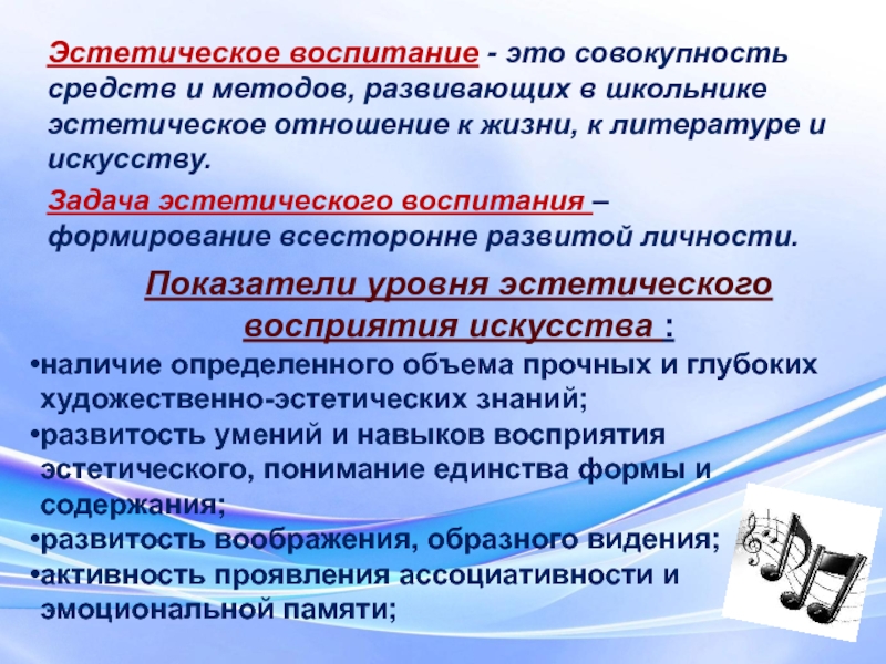 Эстетическое воспитание - это совокупность средств и методов, развивающих в школьнике эстетическое отношение к жизни, к литературе и искусству.