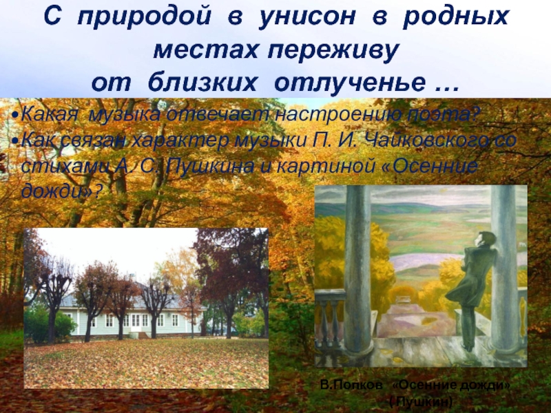 Как связан характер музыки П. И. Чайковского со стихами А. С. Пушкина и картиной «Осенние дожди»?