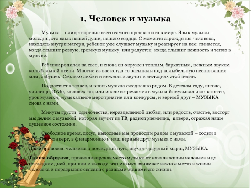 Подрастает человек, и вновь музыка ежедневно рядом. В детском саду, школе, училище, ВУЗе, человек так или иначе встречается с музыкой: музыкальное занятие, урок музыки, музыкальное мероприятие или конкурсы, и верный друг – МУЗЫКА снова с нами.