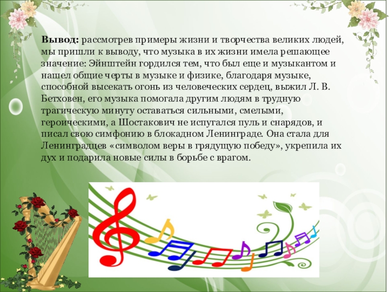 выводу, что музыка в их жизни имела решающее значение: Эйнштейн гордился тем, что был еще и музыкантом и нашел общие черты в музыке и физике, благодаря музыке, способной высекать огонь из человеческих сердец, выжил Л. В. Бетховен, его музыка помогала другим людям в трудную трагическую минуту оставаться сильными, смелыми, героическими, а Шостакович не испугался пуль и снарядов, и писал свою симфонию в блокадном Ленинграде. Она стала для Ленинградцев «символом веры в грядущую победу», укрепила их дух и подарила новые силы в борьбе с врагом.