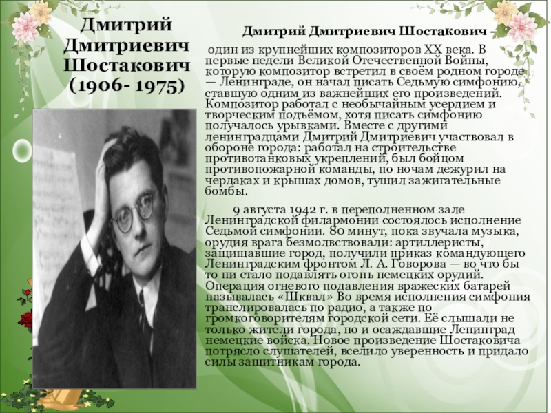 XX века. В первые недели Великой Отечественной Войны, которую композитор встретил в своём родном городе — Ленинграде, он начал писать Седьмую симфонию, ставшую одним из важнейших его произведений. Композитор работал с необычайным усердием и творческим подъёмом, хотя писать симфонию получалось урывками. Вместе с другими ленинградцами Дмитрий Дмитриевич участвовал в обороне города: работал на строительстве противотанковых укреплений, был бойцом противопожарной команды, по ночам дежурил на чердаках и крышах домов, тушил зажигательные бомбы.