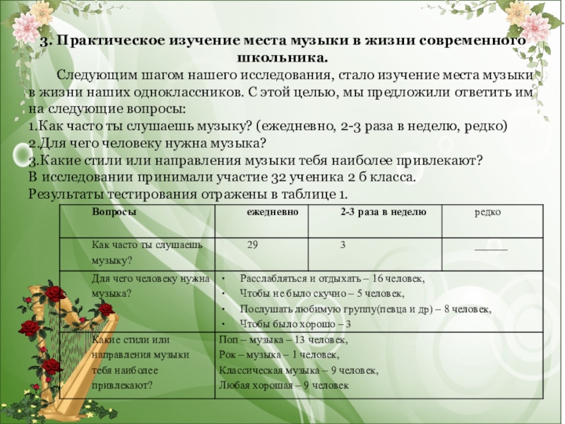 Слайд 113. Практическое изучение места музыки в жизни современного школьника.