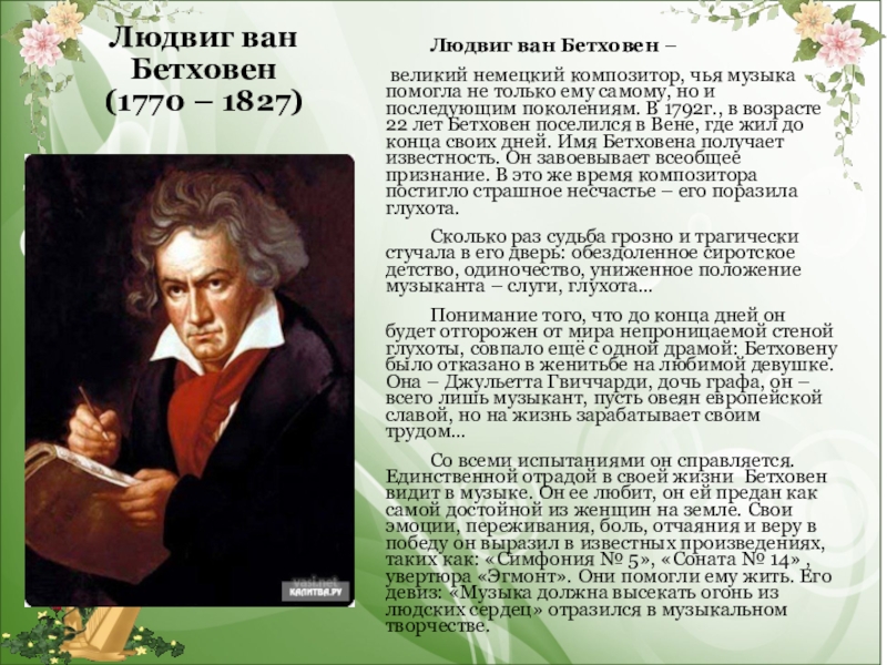 композитор, чья музыка помогла не только ему самому, но и последующим поколениям. В 1792г., в возрасте 22 лет Бетховен поселился в Вене, где жил до конца своих дней. Имя Бетховена получает известность. Он завоевывает всеобщее признание. В это же время композитора постигло страшное несчастье – его поразила глухота.