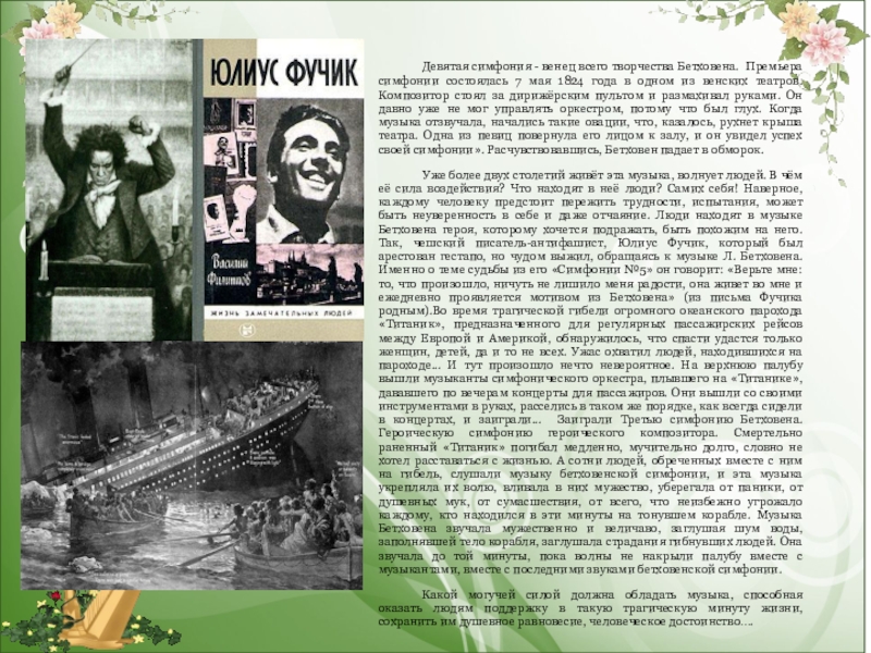 Уже более двух столетий живёт эта музыка, волнует людей. В чём её сила воздействия? Что находят в неё люди? Самих себя! Наверное, каждому человеку предстоит пережить трудности, испытания, может быть неуверенность в себе и даже отчаяние. Люди находят в музыке Бетховена героя, которому хочется подражать, быть похожим на него. Так, чешский писатель-антифашист, Юлиус Фучик, который был арестован гестапо, но чудом выжил, обращаясь к музыке Л. Бетховена. Именно о теме судьбы из его «Симфонии №5» он говорит: «Верьте мне: то, что произошло, ничуть не лишило меня радости, она живет во мне и ежедневно проявляется мотивом из Бетховена» (из письма Фучика родным).Во время трагической гибели огромного океанского парохода «Титаник», предназначенного для регулярных пассажирских рейсов между Европой и Америкой, обнаружилось, что спасти удастся только женщин, детей, да и то не всех. Ужас охватил людей, находившихся на пароходе... И тут произошло нечто невероятное. На верхнюю палубу вышли музыканты симфонического оркестра, плывшего на «Титанике», дававшего по вечерам концерты для пассажиров. Они вышли со своими инструментами в руках, расселись в таком же порядке, как всегда сидели в концертах, и заиграли... Заиграли Третью симфонию Бетховена. Героическую симфонию героического композитора. Смертельно раненный «Титаник» погибал медленно, мучительно долго, словно не хотел расставаться с жизнью. А сотни людей, обреченных вместе с ним на гибель, слушали музыку бетховенской симфонии, и эта музыка укрепляла их волю, вливала в них мужество, уберегала от паники, от душевных мук, от сумасшествия, от всего, что неизбежно угрожало каждому, кто находился в эти минуты на тонувшем корабле. Музыка Бетховена звучала мужественно и величаво, заглушая шум воды, заполнявшей тело корабля, заглушала страдания гибнувших людей. Она звучала до той минуты, пока волны не накрыли палубу вместе с музыкантами, вместе с последними звуками бетховенской симфонии.