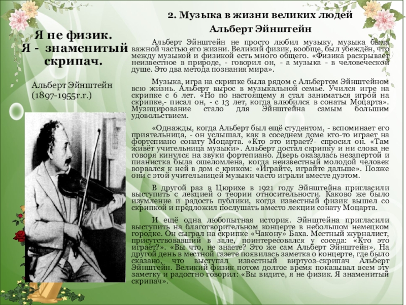 Музыка, игра на скрипке была рядом с Альбертом Эйнштейном всю жизнь. Альберт вырос в музыкальной семье. Учился игре на скрипке с 6 лет. «Но по настоящему я стал заниматься игрой на скрипке,- писал он, - с 13 лет, когда влюбился в сонаты Моцарта». Музицирование стало для Эйнштейна самым большим удовольствием.