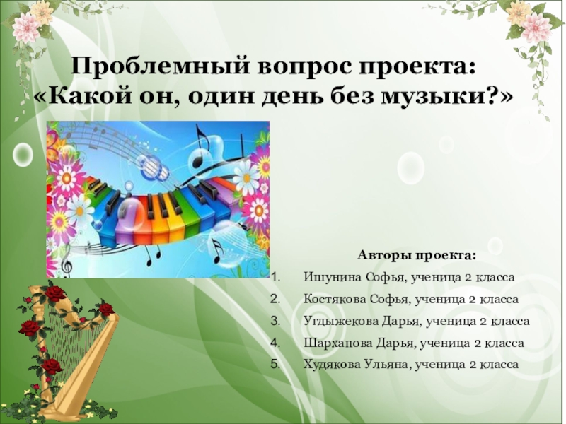 Слайд 1Проблемный вопрос проекта: «Какой он, один день без музыки?»