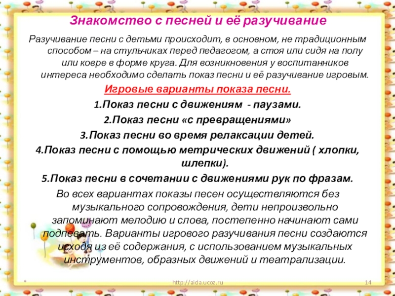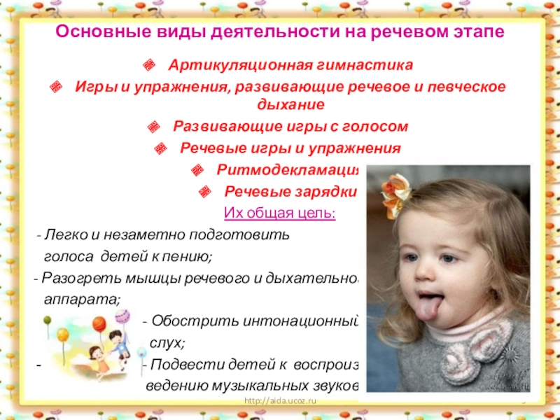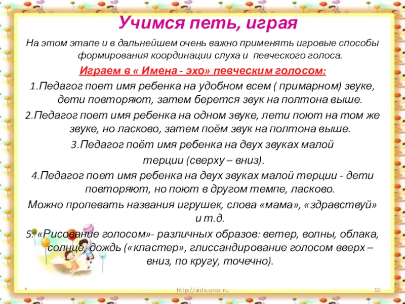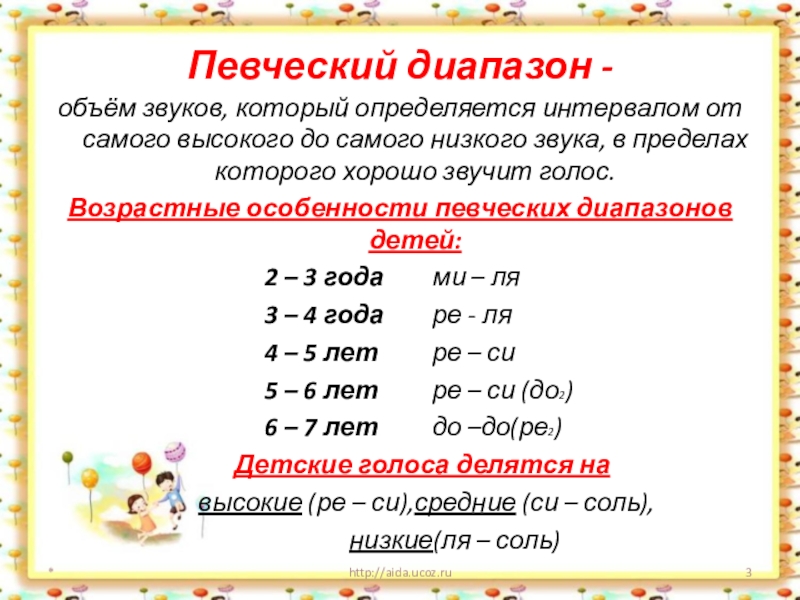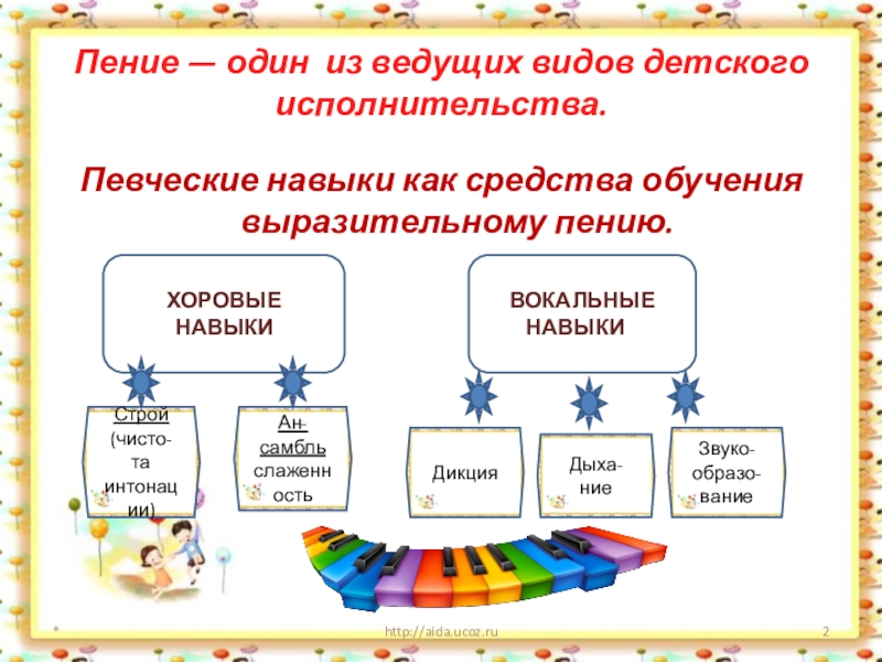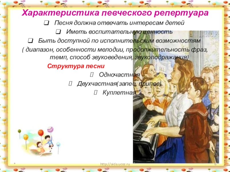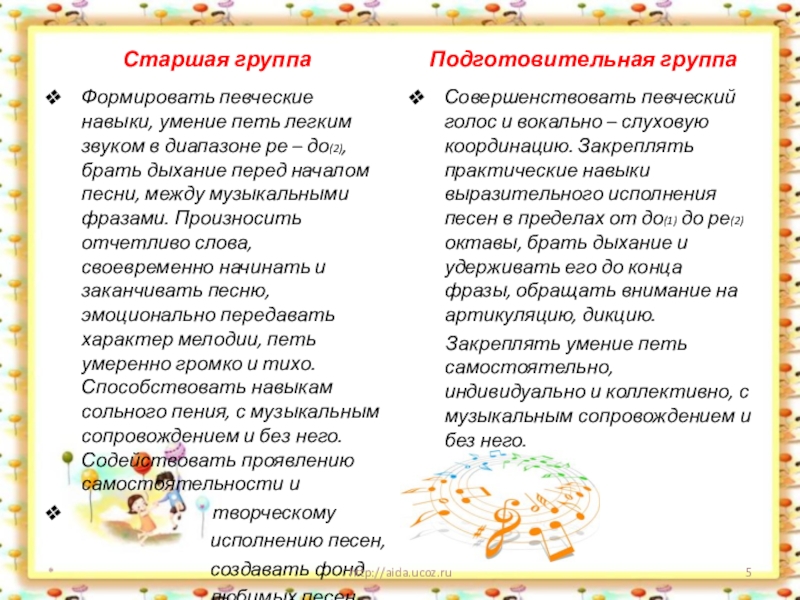 Совершенствовать певческий голос и вокально – слуховую координацию. Закреплять практические навыки выразительного исполнения песен в пределах от до(1) до ре(2) октавы, брать дыхание и удерживать его до конца фразы, обращать внимание на артикуляцию, дикцию.