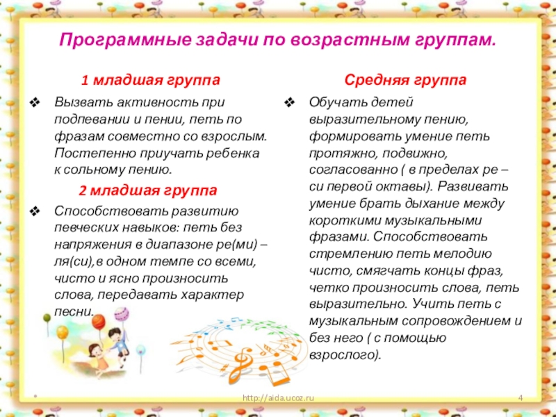 Обучать детей выразительному пению, формировать умение петь протяжно, подвижно, согласованно ( в пределах ре – си первой октавы). Развивать умение брать дыхание между короткими музыкальными фразами. Способствовать стремлению петь мелодию чисто, смягчать концы фраз, четко произносить слова, петь выразительно. Учить петь с музыкальным сопровождением и без него ( с помощью взрослого).