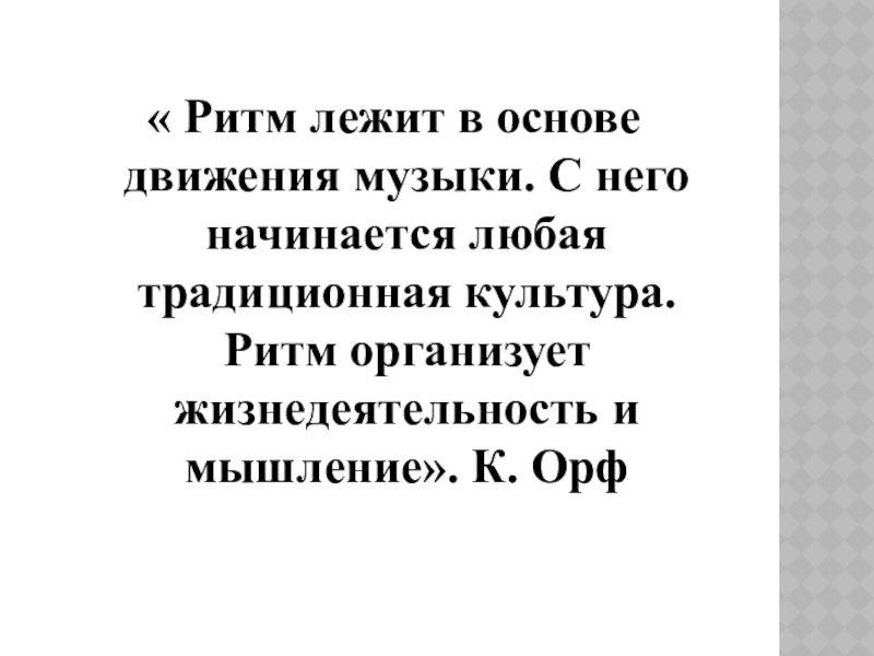 « Ритм лежит в основе движения музыки. С него начинается любая традиционная культура. Ритм организует жизнедеятельность и мышление». К. Орф