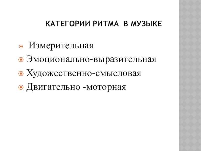 КАТЕГОРИИ РИТМА В МУЗЫКЕ ИзмерительнаяЭмоционально-выразительнаяХудожественно-смысловаяДвигательно -моторная