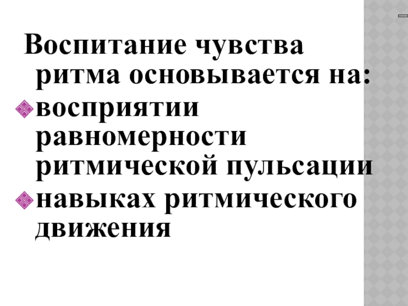 Воспитание чувства ритма основывается на:восприятии равномерности ритмической пульсациинавыках ритмического движения