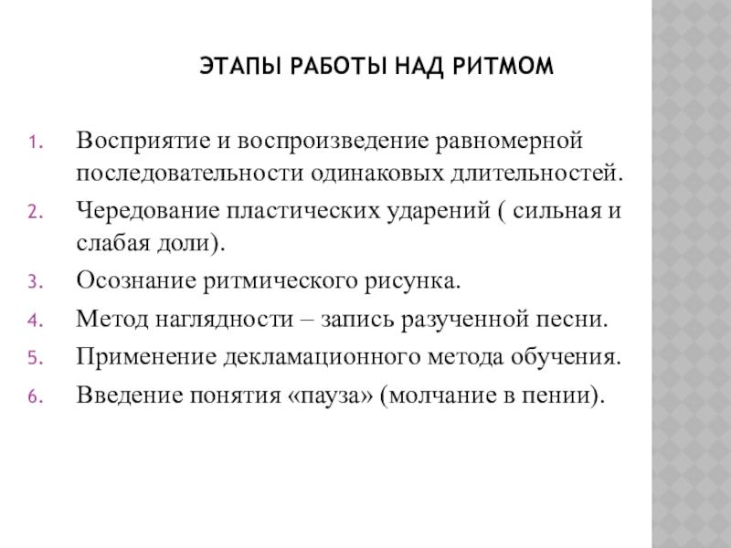 ЭТАПЫ РАБОТЫ НАД РИТМОМВосприятие и воспроизведение равномерной последовательности одинаковых длительностей.Чередование пластических ударений ( сильная и слабая доли).Осознание