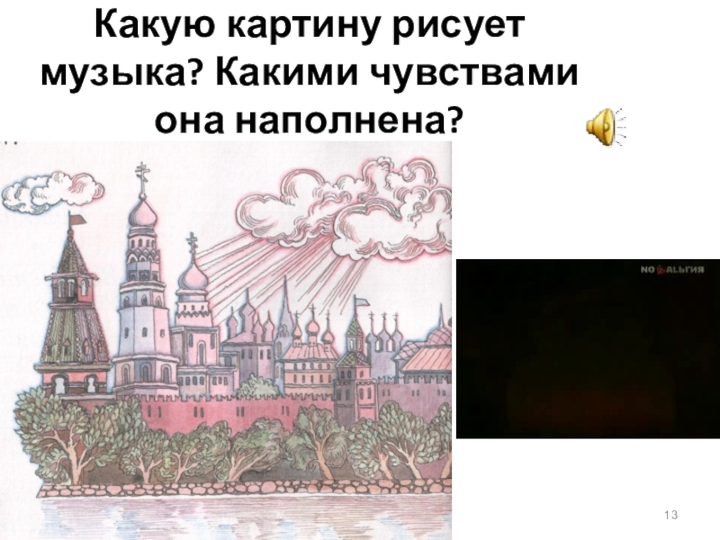 Слайд 13Какую картину рисует музыка? Какими чувствами она наполнена?