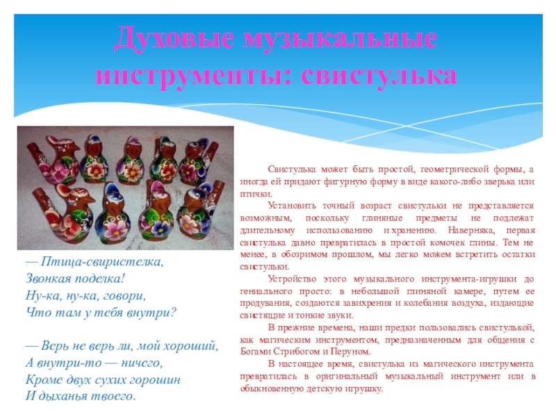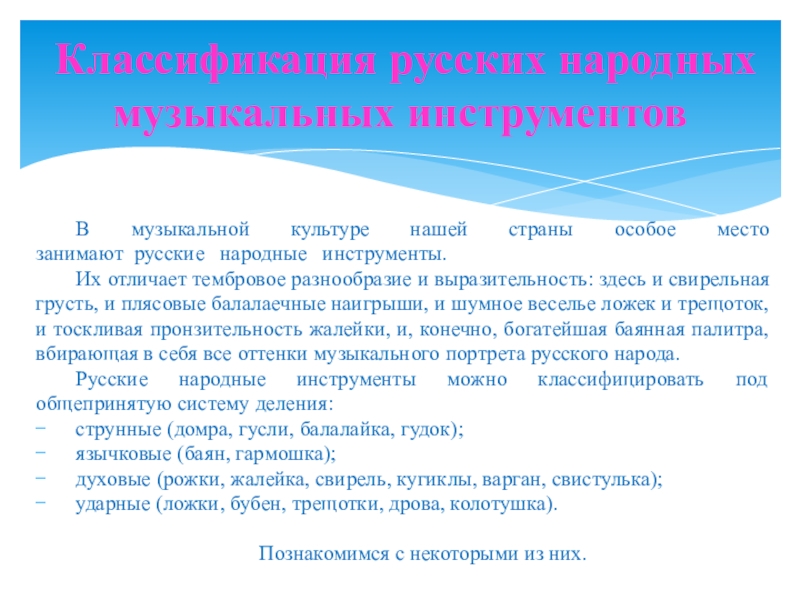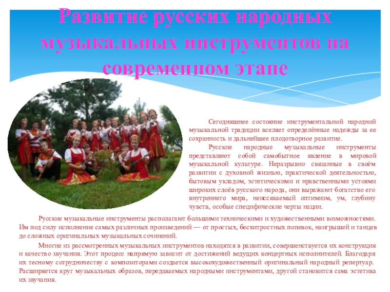 Русские народные музыкальные инструменты представляют собой самобытное явление в мировой музыкальной культуре. Неразрывно связанные в своём развитии с духовной жизнью, практической деятельностью, бытовым укладом, эстетическими и нравственными устоями широких слоёв русского народа, они выражают богатство его внутреннего мира, неиссякаемый оптимизм, ум, глубину чувств, особые специфические черты нации.